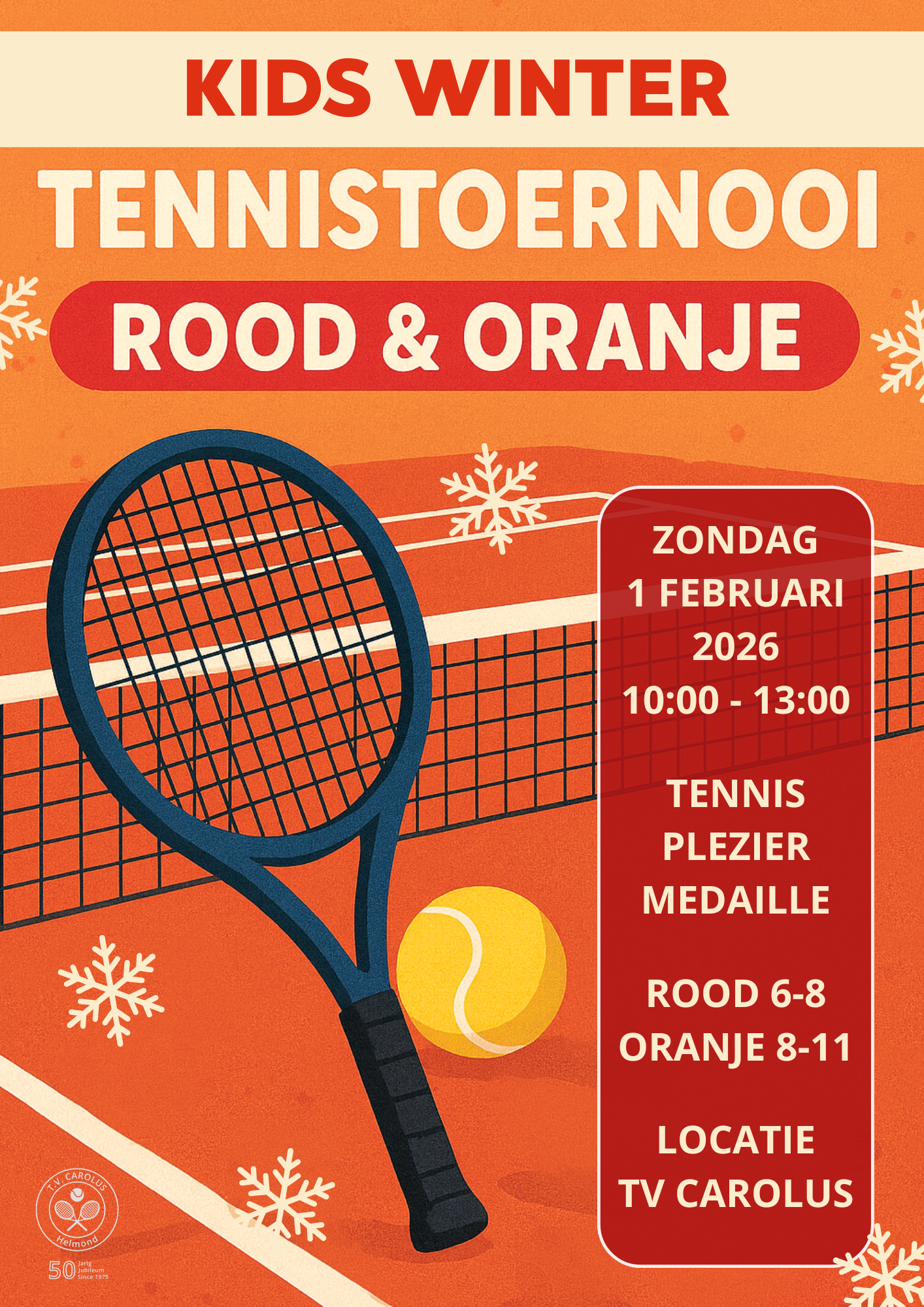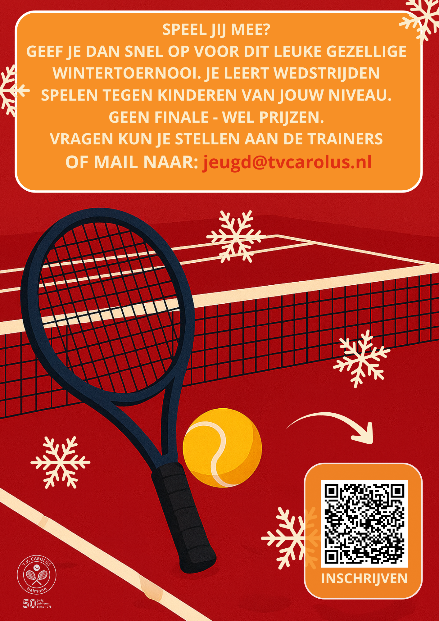 Zondag 1 februari vindt er een wintertoernooi plaats, speciaal voor de tenniskids van TV Carolus. Het start om 10:00 uur en duurt tot 13:00 uur. Ouders zijn uitgenodigd om te komen kijken vanaf de zijlijn of binnen in het clubhuis. Dit toernooi zou aanvankelijk zondag 11 januari zijn, maar wordt/ is vanwege de sneeuwcondities verplaatst.