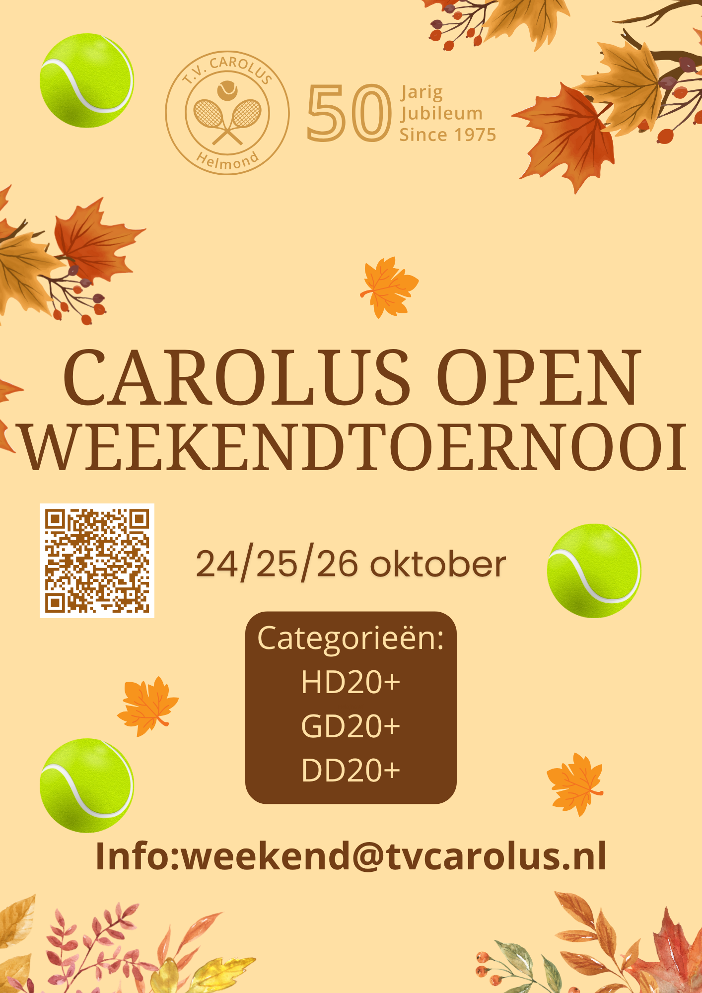 Ter ere van het 50 jarig bestaan van onze vereniging organiseren we een extra open toernooi in weekendformat. Een jubileum herfst editie! Check snel je agenda en schrijf je in want we kunnen een gelimiteerd aantal koppels accepteren. Direct inschrijven middels deze link.