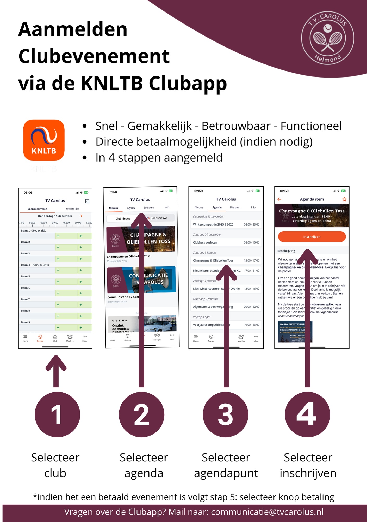 Om een goed beeld te krijgen van het aantal deelnemers en om de banen te kunnen reserveren, vragen we je om je in te schrijven via de aanmeldknop in de clubapp. Deze is te vinden bij agenda --> oliebollentoss of kijk voor een uitgebreide uitleg hier. Deelname is mogelijk vanaf 15 jaar. Alle niveaus zijn welkom. Samen maken we er een gezellige middag van!