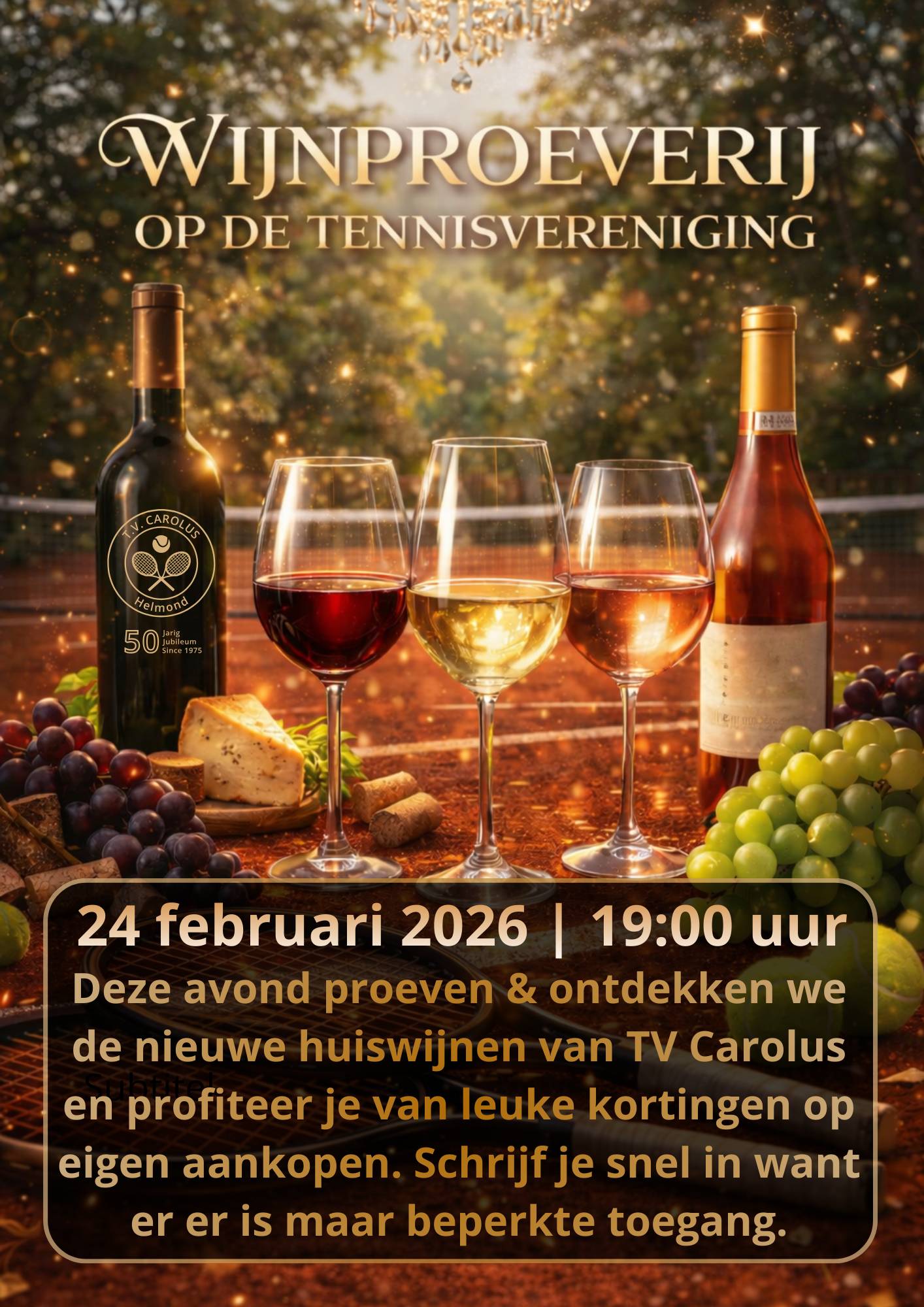 In samenwerking met VanEijk Wijnen verzorgen we op dinsdag 24 februari een wijnproeverij op onze club. Samen proeven & ontdekken we de nieuwe huiswijnen van TV Carolus. De leden kiezen gezamenlijk de favoriete wijnen.